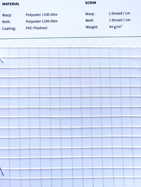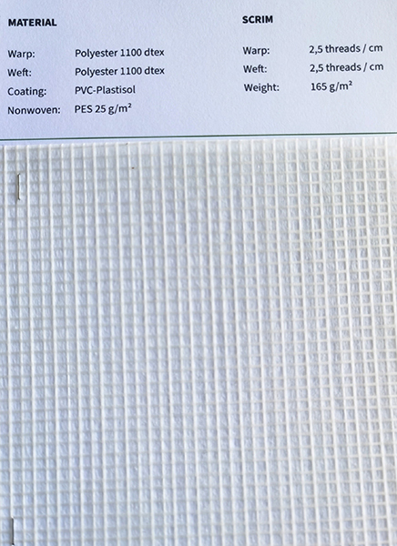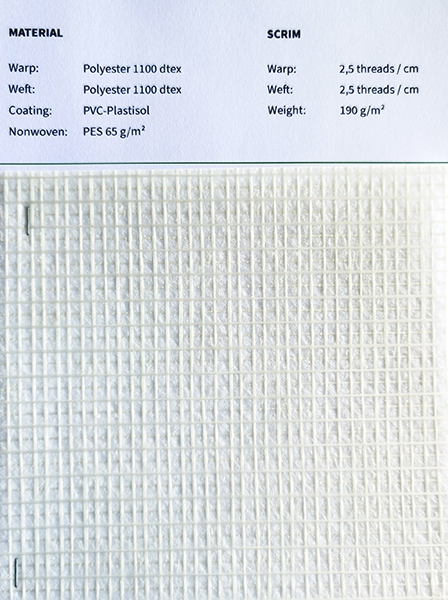 經紗Polyester 1100 dtex 緯紗Polyester 1100 dtex 涂層PVC Plastisol 無紡布PES 25 g/m2 |