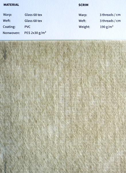 經紗Glass 68 tex 緯紗Glass 68 tex 涂層PVC 無紡布PES 2x30 g/m2 |